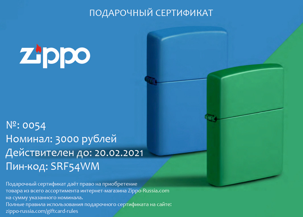 Подарочный сертификат Zippo 10000 от официального дилера Zippo в Алматы. Вы можете дополнительно заказать гравировку, которая подчеркнет Вашу оригинальность и придаст памятность статусному подарку.